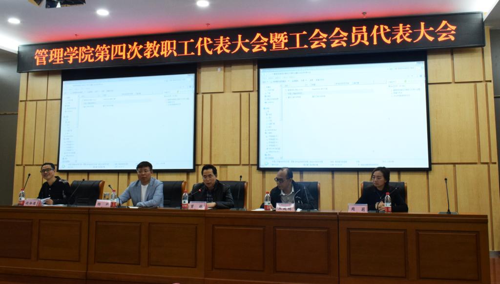4月19日2:00,管理学院第四届第一次教职工代表大会暨工会会员代表大会在新图书馆会议中心会议室一顺利召开。校工会曾林常务副主席,管理学院分党委书记、副院长王建明,管理学院院长、分党委副书记杨柏,副院长周莉,副书记、纪委书记王静,院工会主席饶扬德等出席会议,管理学院教职工参加大会。