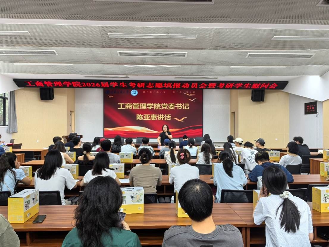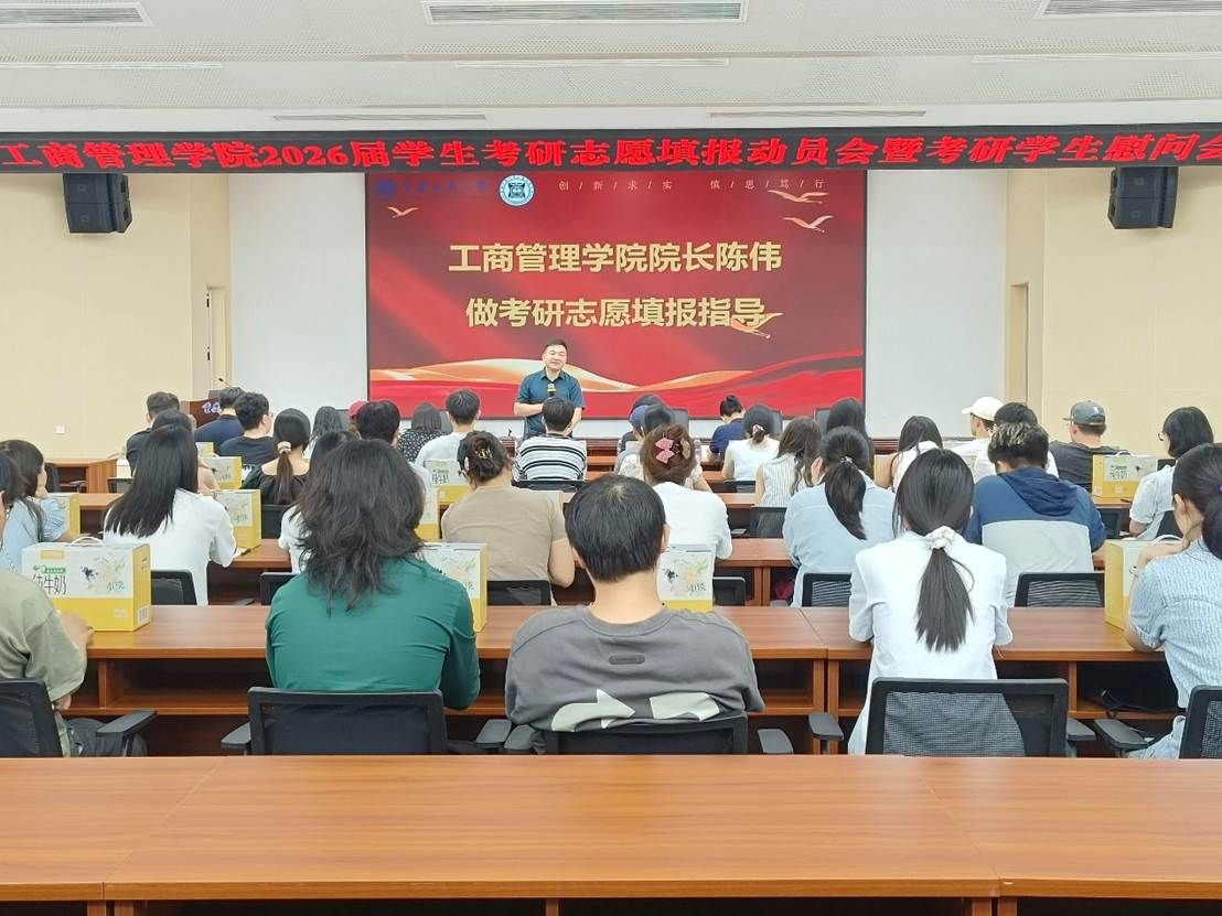2025年9月18日,2138cn太阳集团古天乐在明德楼1019会议室举行了2026届学生考研志愿填报动员会暨考研学生慰问会。学院党委书记陈亚惠、院长陈伟、党委副书记程亚、学院学工办主任谭予涵、辅导员樊少华、禹洋春、郑娴、黄韵以及部分2022级考研同学参加了此次活动。会议由学院党委副书记程亚主持。