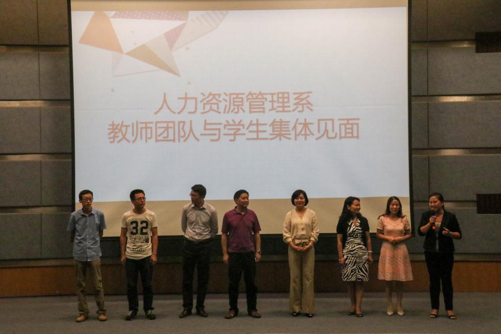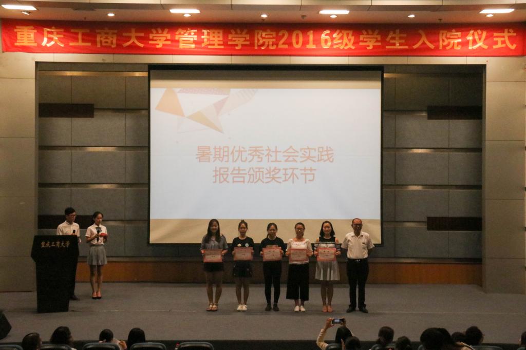 继而学院领导依次为获得优秀暑期社会实践报告的学生颁奖。随后是各系师生集体见面,工商管理系、人力资源管理系、工程管理系以及信息管理与信息系统系全体教师依次上台,做简单的自我介绍与对学生们的寄语。教师们的发言有的幽默,有的严肃,但想表达的却相同,即希望2016级全体学生都能在接下来的大学学习中学有所成,学有所获。党政办、教务办以及学团办负责人都分别上台为学生们介绍他们与学生相关的工作,并希望同学们能积极地与之交流。15级学生代表肖潇上台发言,分享其大学生活,告诫学妹学弟们勤劳的重要性,同时需怀有越优秀越努力的心态以及不怕过往,不惧未来的勇气。