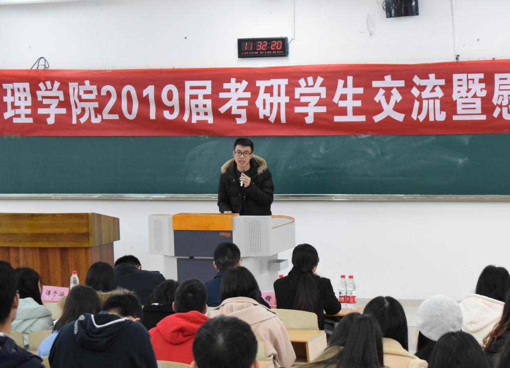 紧接着研究生代表依次上台与大家交流考研心得,向玥颖同学分享了通过建立知识框架来查缺补漏的政治复习方式,并告诉大家有技巧的背教材能有效提高复习效率,同时建议学弟学妹可以通过老师、学长、学姐和借助互联网了解目标学校与导师的两种渠道。屈阳同学就考研数学的复习表示了自己的独到见解,告诉大家冲刺阶段的重要性,一定要合理分配好做题时间。杜婧同学就考研英语阐述了高效复习的技巧,也教给同学们如何缓解自己心理压力的方法。程锴同学则针对专业课的考前攻克,为同学们介绍了一系列巩固知识的技巧。最后许浩同学将考研复试的注意事项一一道来,并为同学们介绍面试阶段的志愿调剂事项。