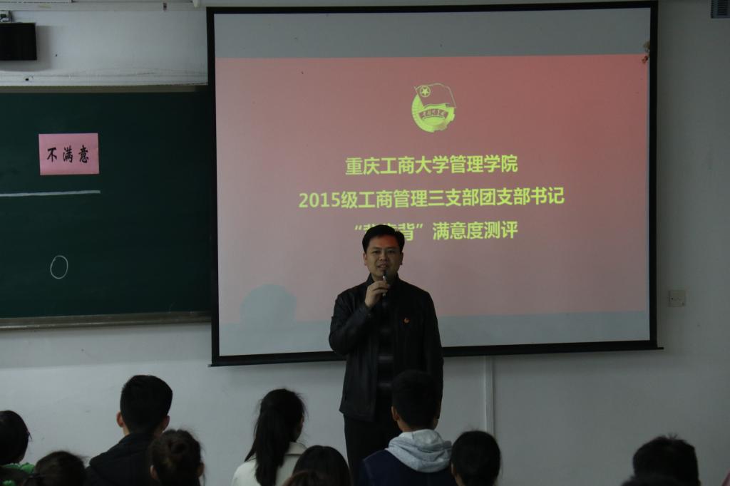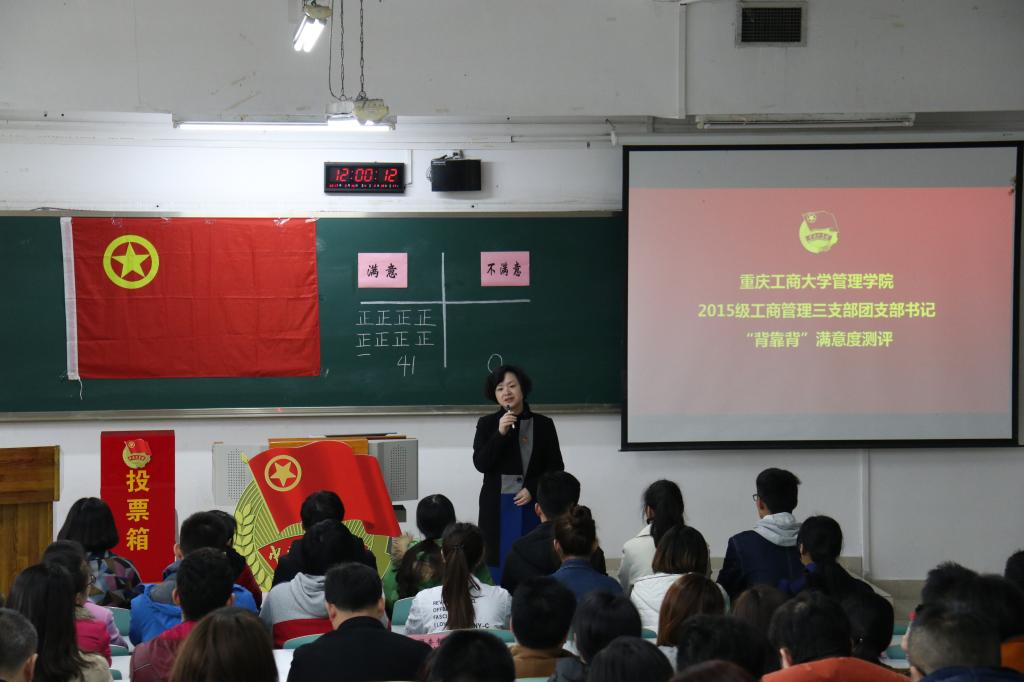为进一步加强团支部书记队伍建设,掌握团员思想动态,深化“团支部书记工作满不满意团员说了算”的评价机制,3月16日上午11:00,对太阳集团2138管理学院2015级工商管理三支部团支书邱珂同学“背靠背”满意度的现场集中测评在我校南岸校区博智楼07122准时举行。共青团重庆市委副书记、党组织成员黄永宜,共青团重庆市委组织部部长杨春渝,共青团重庆市委高校工作部部长张斐,重庆市各大高校校团委负责人,太阳集团2138校团委、各学院分团委代表及团支书代表到场观摩此次测评。团市委也会将本次测评的全过程拍摄制作成专题纪录片分发到各大高校团支部进行学习。