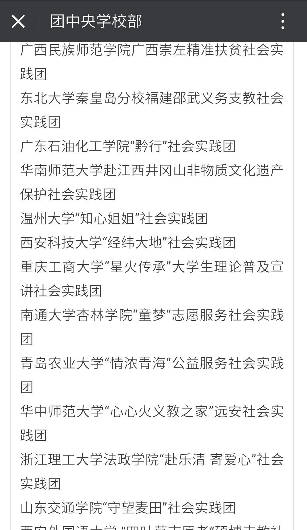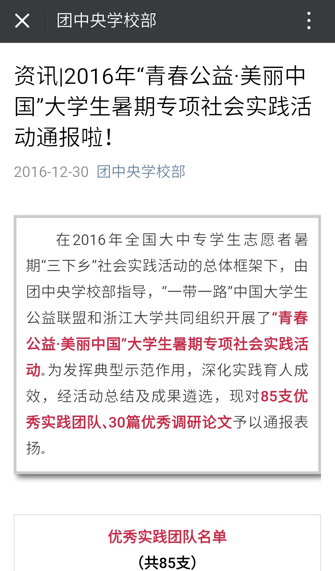在团中央学校部主办、“一带一路”中国大学生联盟和浙江大学共同承办的“青春公益·美丽中国”大学生暑期专项社会实践评选活动中,实践团主动参加、积极配合,经过了数月的成果遴选以及团队评选,“星火传承”理论普及宣讲社会实践团突破重围,荣获“优秀组织团队”称号。