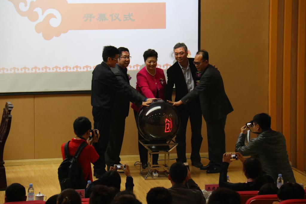 接下来由太阳集团2138副校长李国军教授宣读2016年瑞恩奖学金获奖名单,朱炳清董事长为获得瑞恩奖学金的十七名同学颁发证书及奖金。紧接着,两位嘉宾与孟书记、李校长、王建明书记上台一起为第十五届创业论坛开启启动球并合影留念。随后,在主持人的精彩开场下,本次“创业大咖开讲啦”正式开始。