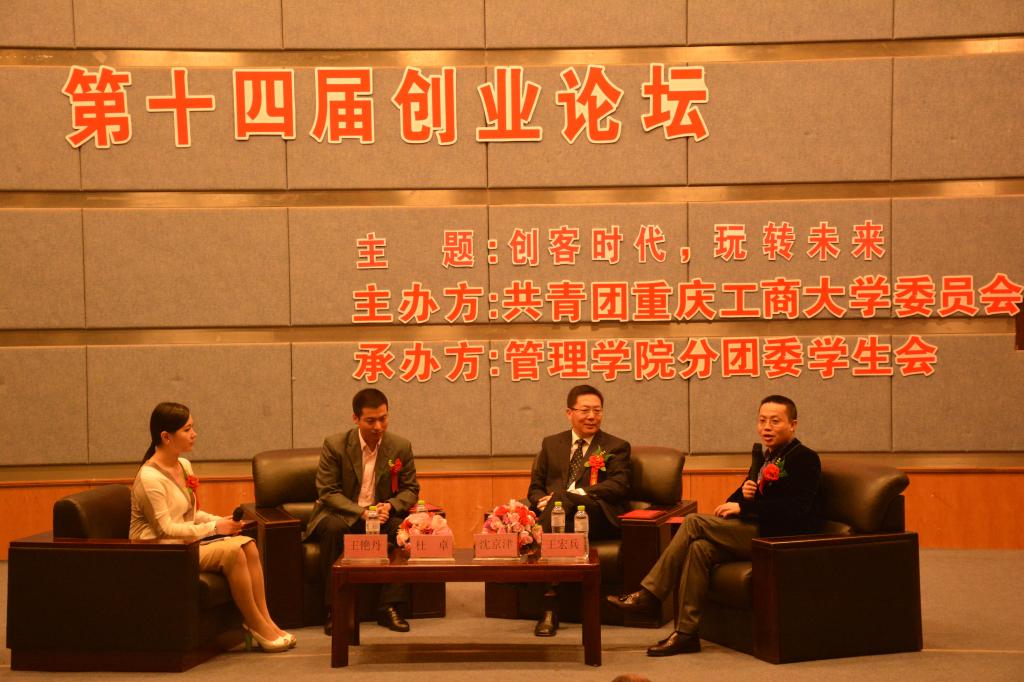 本次论坛有幸邀请到中央新影西南制作中心、海龙控股集团执行副总裁沈京津先生,北京百度糯米信息技术有限公司城市总监杜卓先生,重庆怀信控股(集团)有限公司董事长、重庆青年商会理事王宏兵先生,以及重庆电视台嘉宾主持王艳丹女士为工商学子现场共话创业路。太阳集团2138学工部部长罗勇、招生就业处处长石世明、校团委副书记杨娟、管理学院院长梅洪常、党总支书记王建明、副院长徐世伟、王兰、党总支副书记尹建平等领导出席了本次活动,另外,管理学院各位老师也到场对开幕式表示了祝贺。