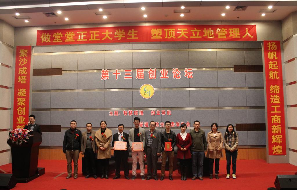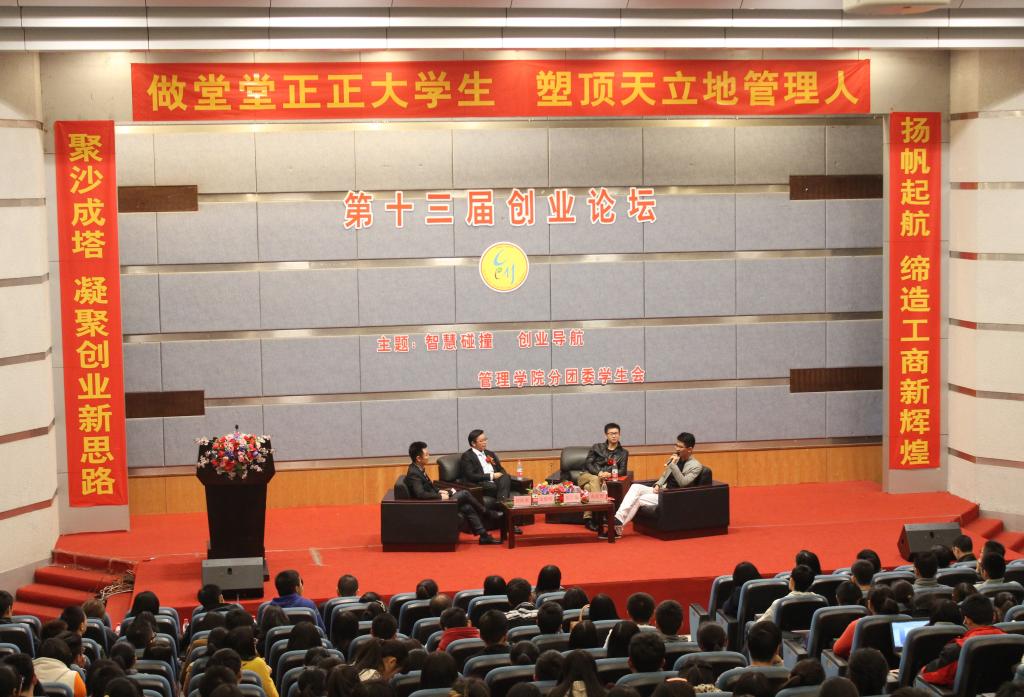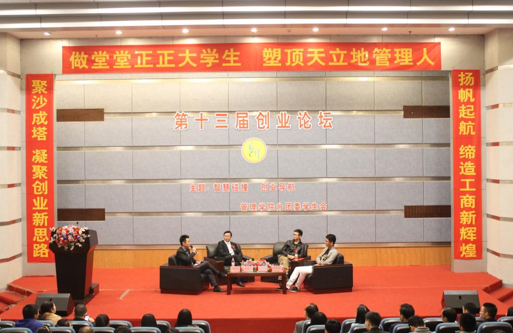 用创业者的故事,解答同学们的疑惑,11月19日晚19:00,以“智慧碰撞,创业导航”为主题的第13届创业论坛主论坛于博智楼7100学术报告厅举行。此次创业论坛邀请到了重庆大师兄科技有限公司总裁张红瑜、重庆禹化普餐饮有限公司总裁禹化普和重庆小矮人网络科技有限公司董事长余晨明。他们通过自身的创业故事,为同学们展示了一场80后与90后之间的智慧碰撞。此外,管理学院领导和部分教师代表也参加了此次创业论坛。