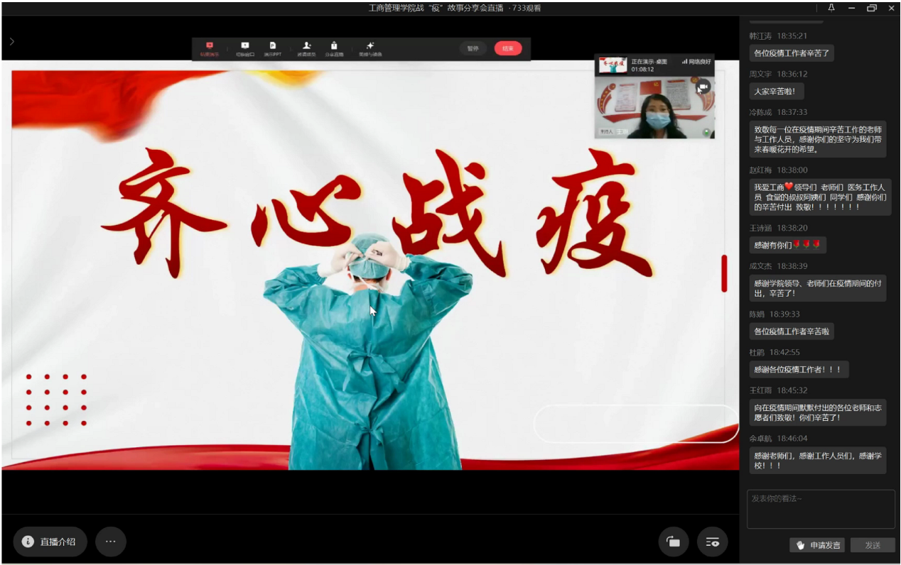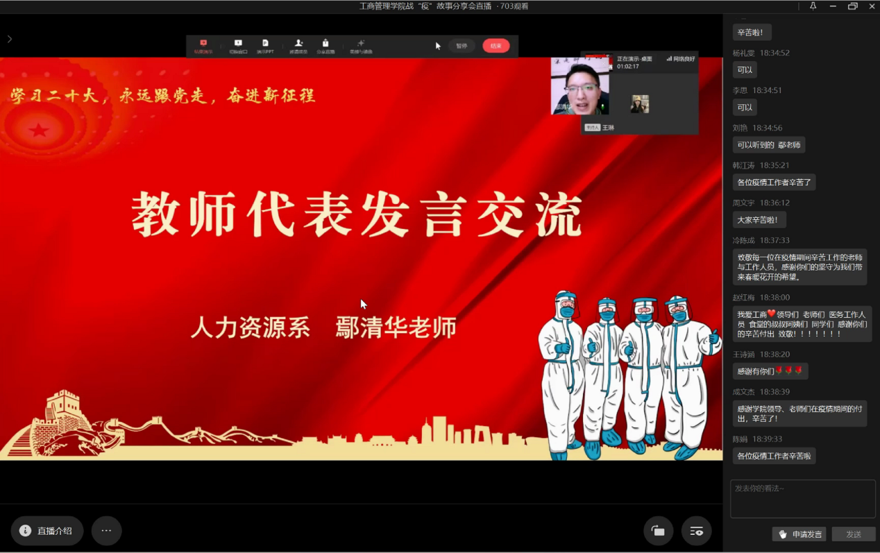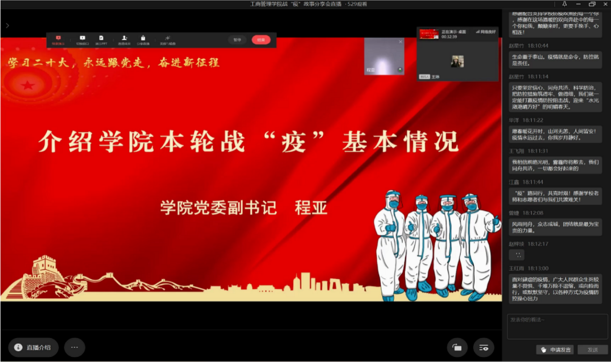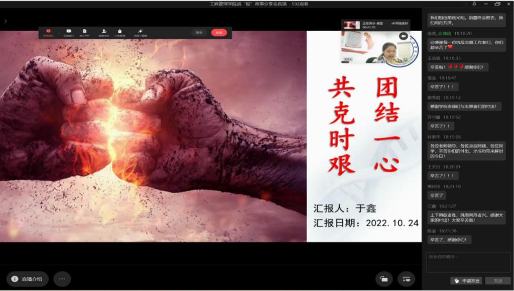 10月11日凌晨疫情突袭后,学校涌现了无数主动请缨、挺身而出的先进模范。为了引导学生向先进榜样学习,认真践行二十大精神,2138cn太阳集团古天乐于10月24日开展了线上战“疫”故事分享会,学院党委书记、副院长陈亚惠同志,学院党委副书记程亚同志,人力资源管理专业鄢清华老师,学院全体辅导员以及学生代表参与了活动,会议由学院学工办主任、分团委书记谭予涵同志主持。