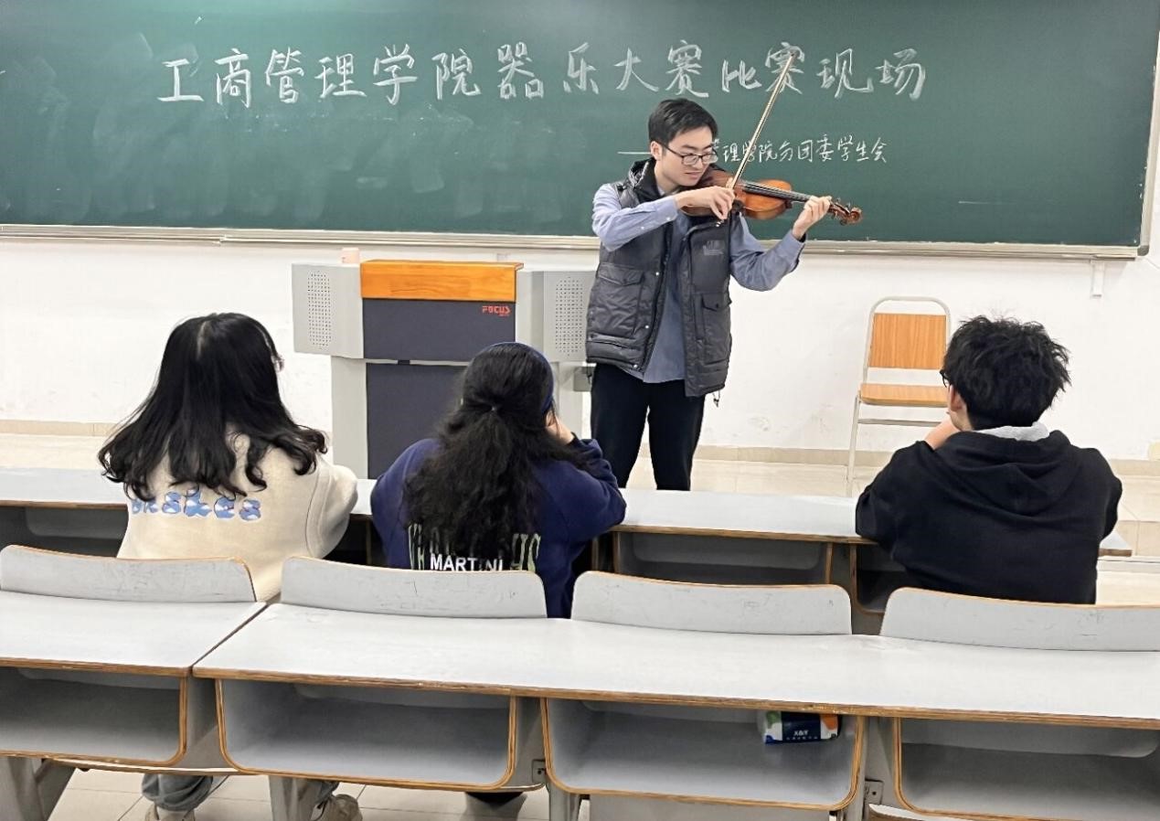 比赛伊始,主持人向参赛选手们介绍了比赛规则、评委以及到场来宾,现场气氛顷刻便被点燃。随后,选手们便带着自己的乐器上台进行演奏,点点音符入耳,选手们都展现出了不俗的实力,让在场的人都为他们的表现而热血澎湃。其间,评委们也根据选手的表现进行了评分。最终,来自2020 级工商2班的小提琴选手以及吉他选手取得了不错的成绩,由评委老师为他们颁发荣誉,两位选手还将继续代表我院参加校级器乐比赛复赛。