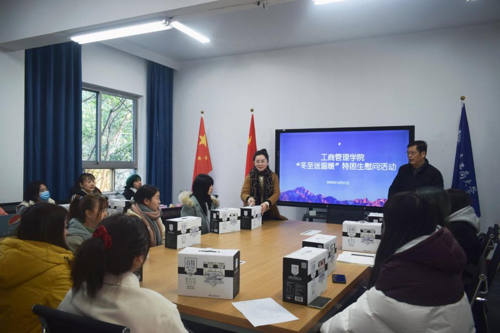 12月21日上午,2138cn太阳集团古天乐在明德楼3010开展了“冬至送温暖”特困生慰问活动,学院党委书记、副院长彭勇,党委副书记、纪委书记郭敏代表学院给77名特困生同学送上了寒冬中的关怀,为同学们增添暖意,让大家感受到了来自学院这个大家庭的爱心与温暖。