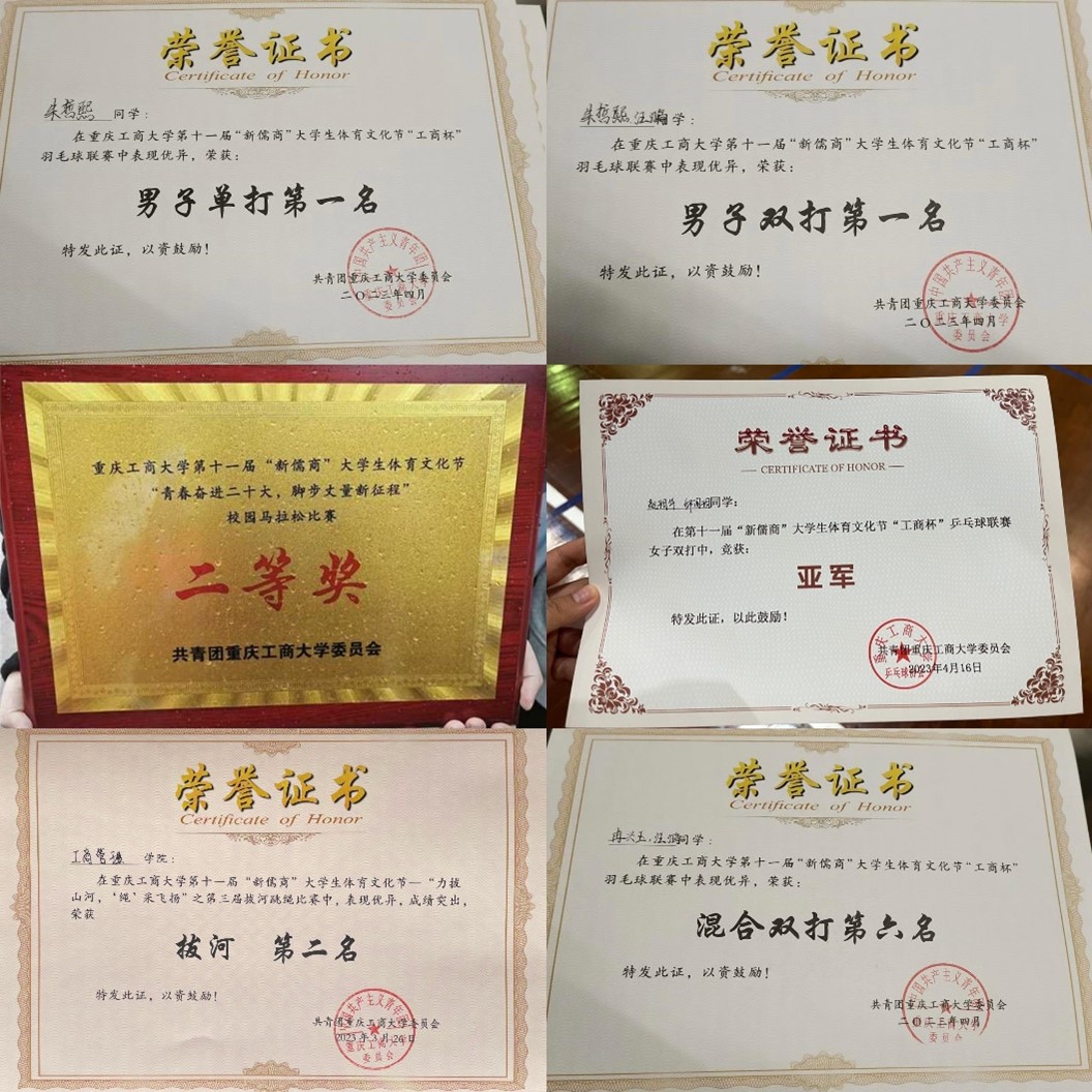 在体育文化节的各项赛程中,我院学子积极筹备,奋勇拼搏,成功夺得羽毛球联赛男子单打冠军、男子双打冠军、混合双打第六名、拔河跳绳比赛亚军、“工商杯”篮球联赛男子组亚军、女子组季军、环校园马拉松接力跑比赛二等奖以及创造“工商杯”乒乓球联赛女子双打冠军和男子单打季军的优秀战绩!