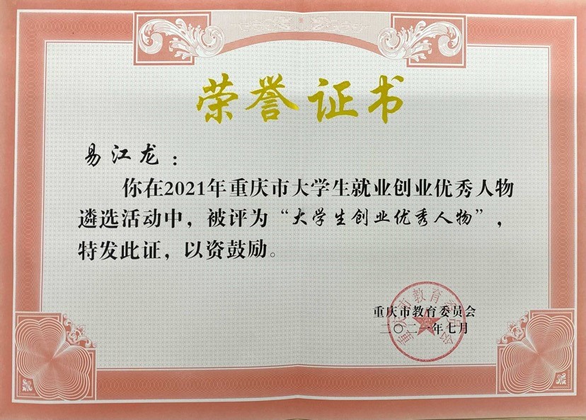 易江龙为社会教育事业做出的杰出贡献以及成功的创业经历,荣获2021年重庆市“大学生创业优秀人物”。