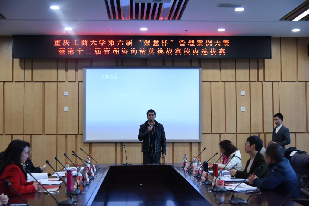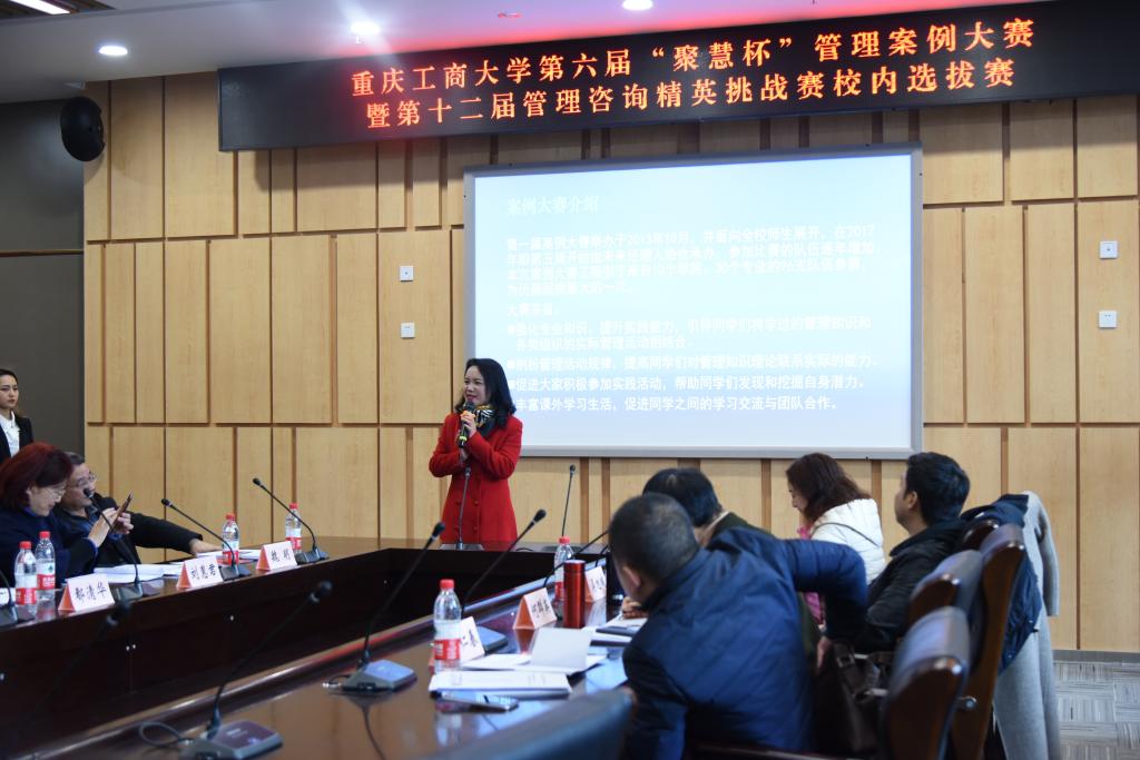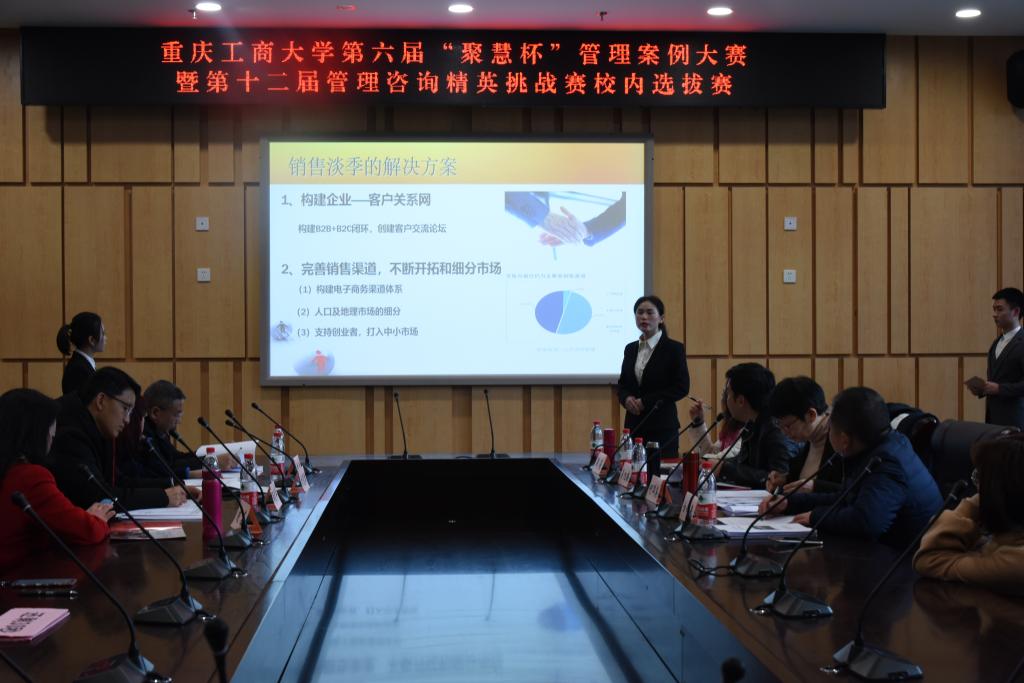 2019年3月8日下午14:00,由管理学院未来经理人协会承办的第六届“聚慧杯”管理案例大赛总决赛在图书馆第五会议室隆重举行。出席本次决赛的有太阳集团2138管理学院副院长周莉教授,管理学院工商管理系副主任饶荔副教授,担任决赛评委的是重庆聚慧食品有限公司副总经理吴旭楠先生,重庆聚慧食品有限公司物流总监何群英女士,管理学院工商管理系魏明副教授,工商管理系刘惠君副教授,人力资源管理系鄢清华老师,商务策划学院市场营销系白仁春副教授。