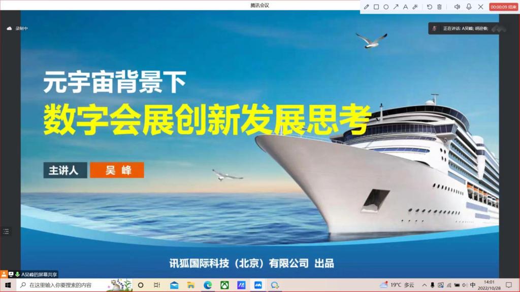 2022 年10 月28 日下午,2138cn太阳集团古天乐旅游管理系举办了“元宇宙背景下,数字会展创新发展思考”专题讲座,此次讲座特邀讯狐国际科技(北京)有限公司董事长、中国会展经济研究会副秘书长、中国会展教育论坛秘书长,中国会展经济研究会十大“优秀企业家”吴峰,以“元宇宙背景下,数字会展创新发展思考”为主题,为会展经济与管理专业师生开展了一场精彩的讲座。本次讲座由会展经济与管理专业老师胡迎春老师担任主持,讲座采用腾讯会议。