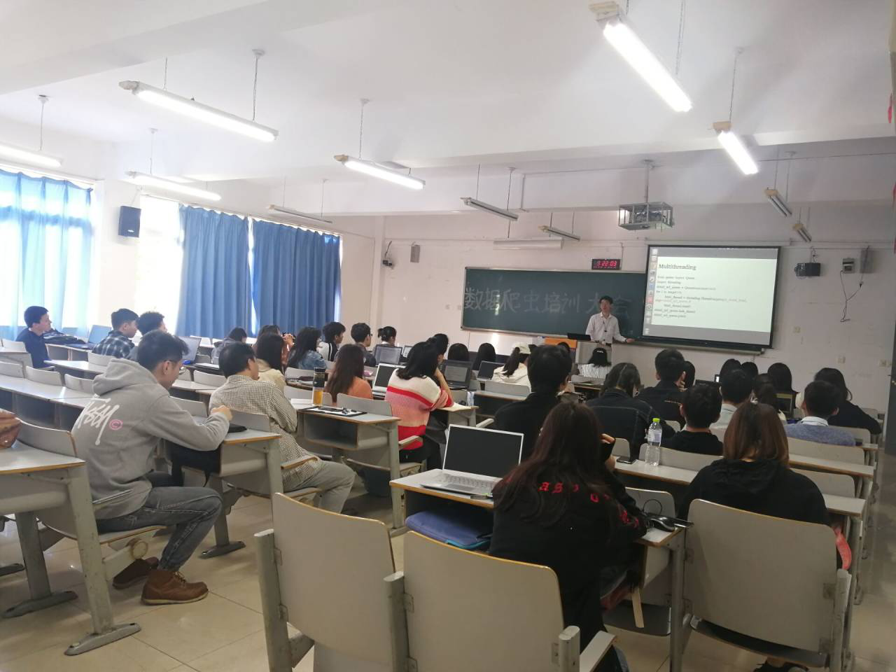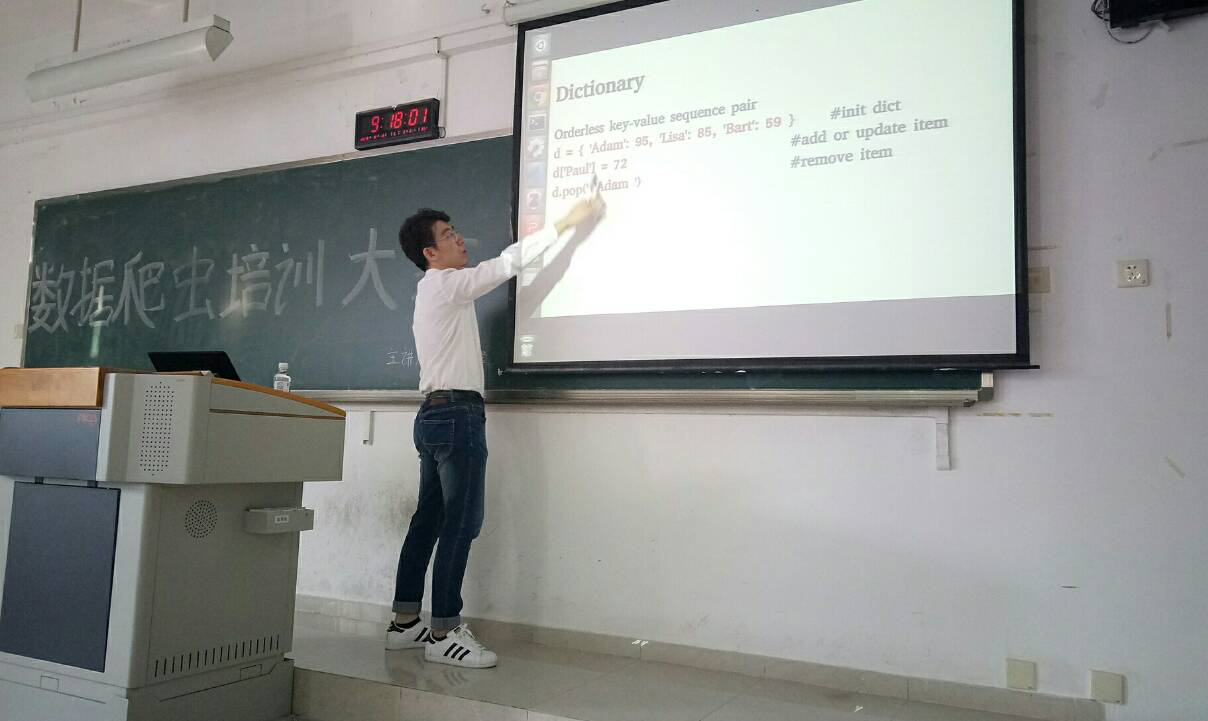 早上9点整,培训大会正式开始。大会上,吕老师从Python基础、如何构造一个爬虫、反爬虫和反反爬虫、crapy框架这四个方面对爬虫的知识进行了清晰地讲解,同学们认真聆听,并用自带的笔记本电脑跟随老师的演示进行操作,现场学习氛围浓厚,同学们学习热情高涨。同时,出席的本次培训大会的老师们也对培训内容及模式表示高度认可,并希望同学们通过此次培训能提高自身爬虫分析能力,在之后的比赛中更好地展现自我。