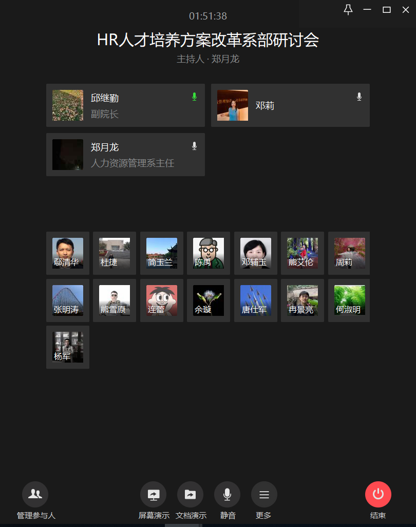 8月10日晚20点,人力资源管理专业2020级人才培养方案系部研讨会通过企业微信如期举办。学院副院长邱继勤教授,人力资源管理系主任郑月龙博士、副主任熊艾伦博士以及人资系全体教师参加了本次会议,会议由郑月龙博士主持。