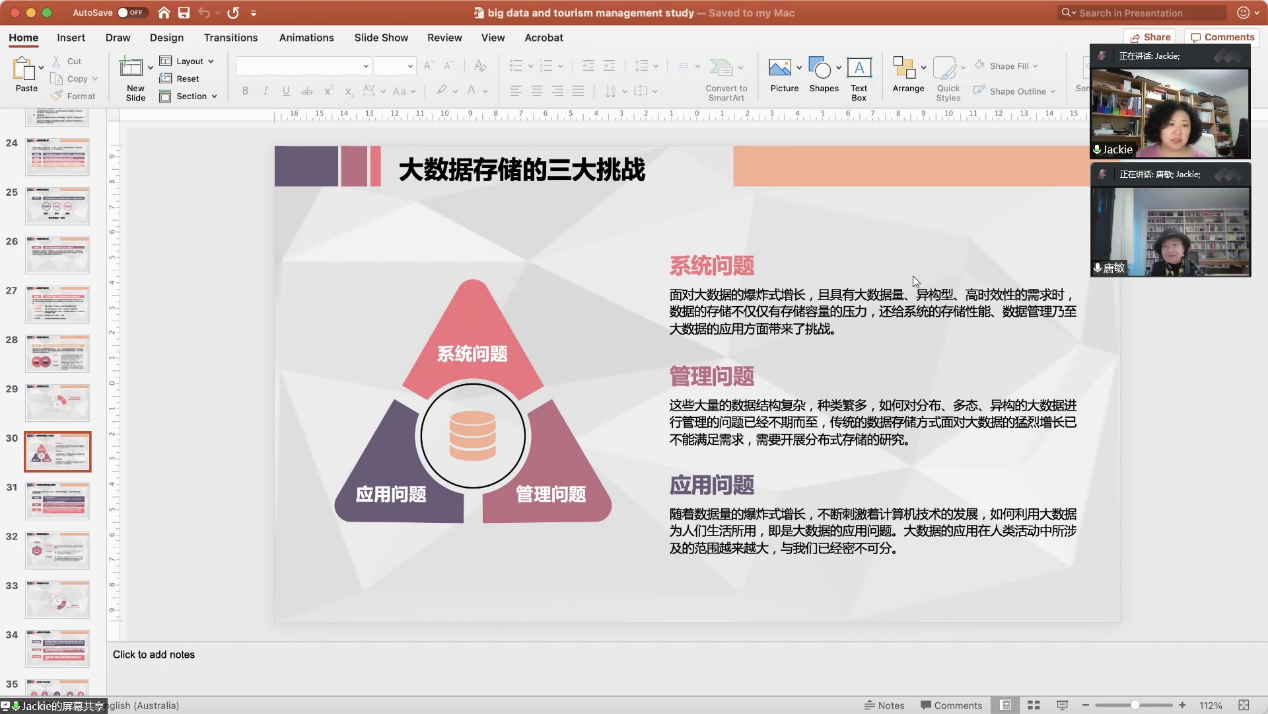 为了遵循理论联系实际的教学原则,帮助同学们更好地理解所学知识,20221023日下午,唐敏老师邀请澳大利亚莫纳什大学荣佳老师在2019级工商管理班的《大数据分析与应用》线上课堂上与同学们分享大数据在旅游业的应用。