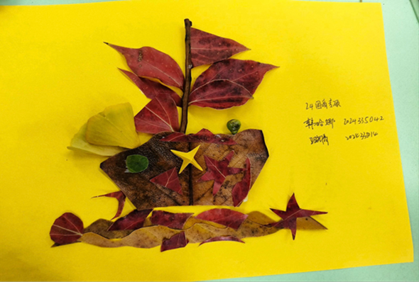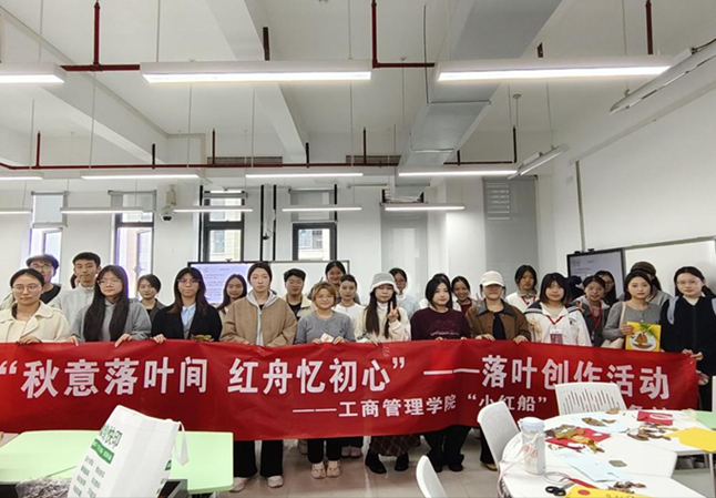 活动伊始,主持人带领同学们走进那段峥嵘岁月,重温“红船精神”的历史背景与精神内核。在党史问答环节中,同学们踊跃发言,在思想碰撞中深化了对“红船精神”的理解。创作环节中,大家以落叶为纸、以初心为笔,将一片片金黄的秋叶细细拼贴成象征中国革命起点的“红船”。现场氛围专注而热烈,剪刀轻舞、胶水点缀,每一件作品都承载着同学们的赤诚之心。分享环节中,有同学感慨:“没想到落叶也能‘讲述’红色故事,亲手制作红船的过程,让我更加理解了什么是‘不忘初心’。”活动不仅锻炼了同学们的动手能力与团队协作意识,更以艺术的形式让红色文化“活”了起来,悄然浸润心田。