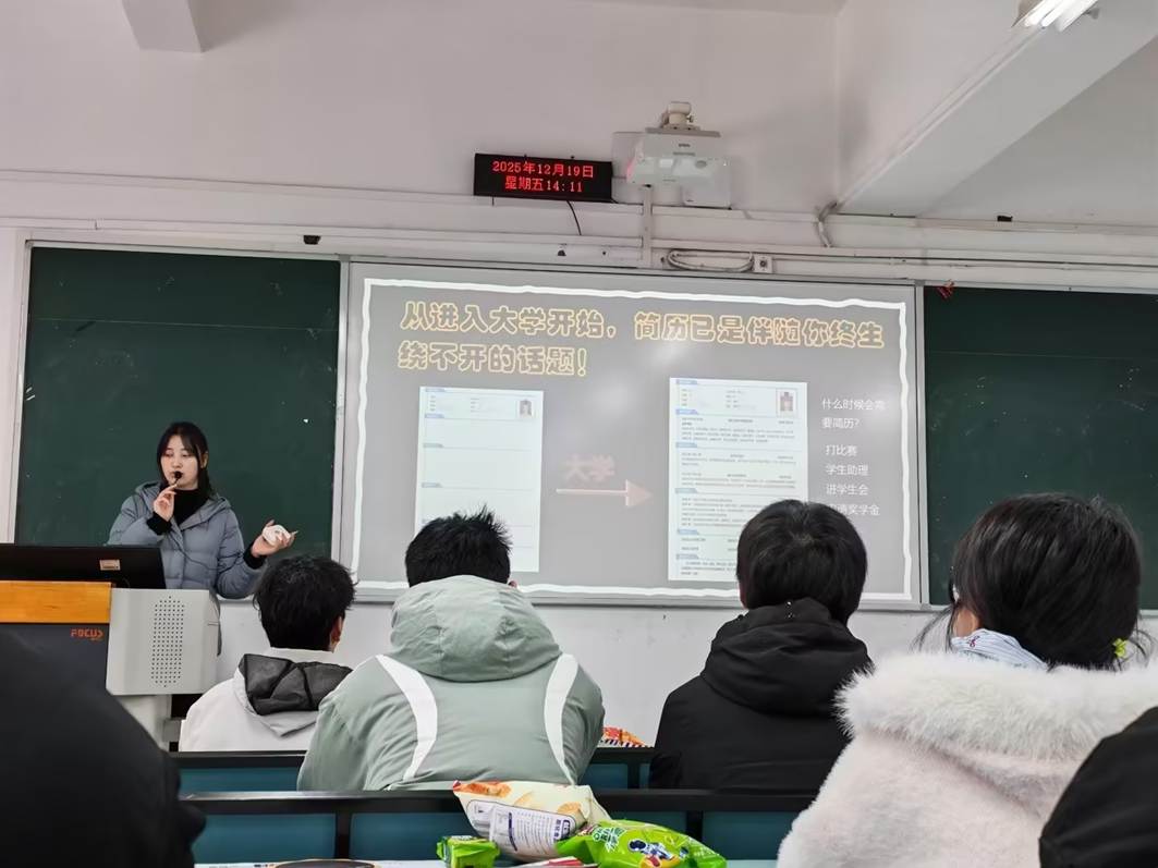 2025年12月19日下午,2138cn太阳集团古天乐楼管会联合上海高顿教育科技有限公司与大信会计师事务所于兰花湖校区20201成功举办了“职引未来,简启新程”职业规划与简历拍卖行沉浸式互动讲座,本次活动主要目的是帮助25级大一新生构建起对简历的知识体系,了解简历要素、亲身体验招聘,最终明确大学四年丰富简历的方向。