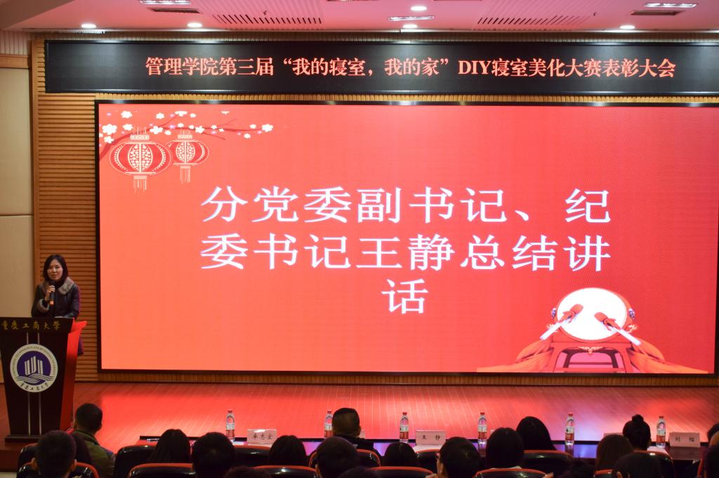 为了营造健康、文明、积极的寝室文化氛围,促进同学之间的交流沟通,创造文明舒适的学习生活环境,丰富同学们的大学生活,2019年11月19日由管理学院主办、管理学院楼栋管理委员会承办的第三届“我的寝室我的家” DIY寝室美化大赛表彰大会在博智楼7200报告厅举行。管理学院分党委副书记、纪委书记王静,学生处公寓管理科陈剩勇,管理学院学工办副主任谭予涵以及辅导员卓志宏、刘榴、张檬出席了本次表彰大会。