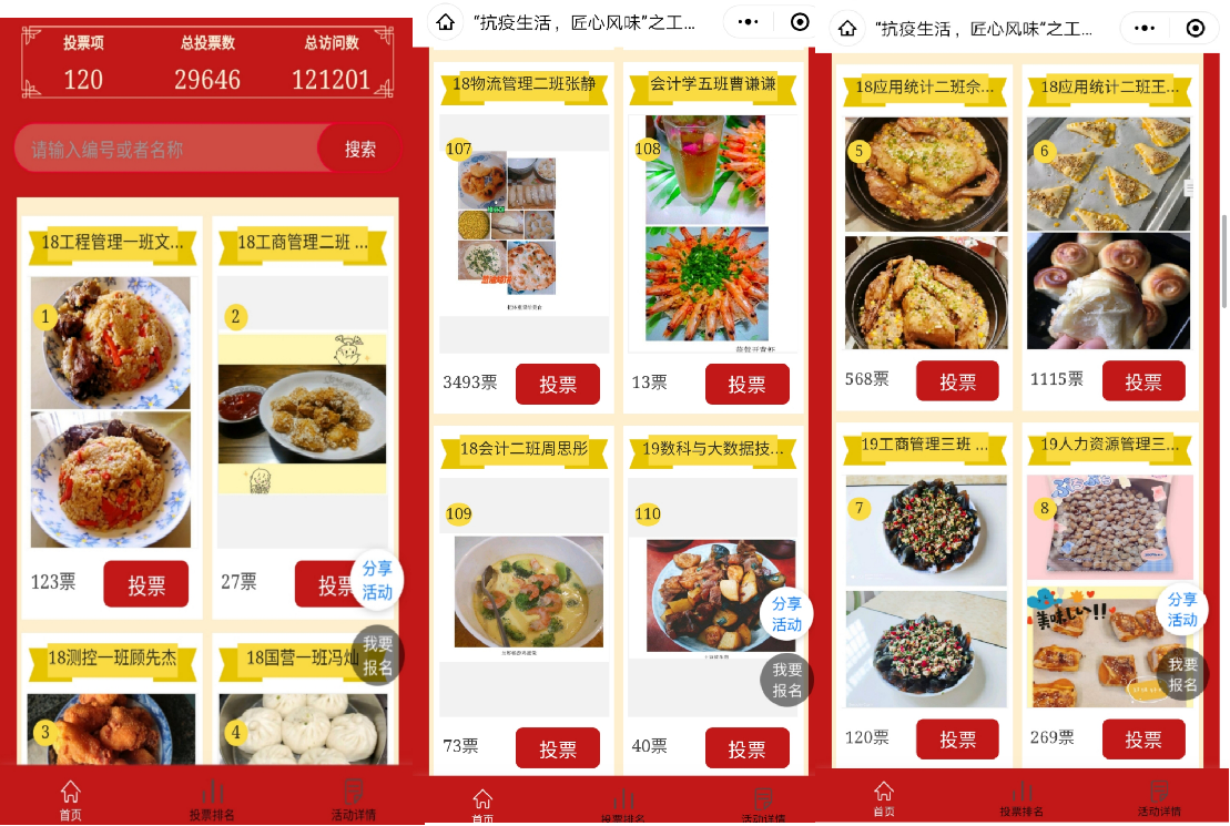 本次活动受到全校学生的高度关注,大家踊跃参赛,纷纷施展个人绝活,展现各地风味美食,共收到400多份色香味俱全的美食作品。经过评委公平公正地精心挑选,120份优秀作品进入下一轮决赛,投放于管理学院官方微信公众号进行大众投票。在紧张刺激的投票环节,这些造型各异、五颜六色的厨艺作品吸引了大批观众前来欣赏。在短短几天内,投票界面的总访问数突破了12万次,总投票数近3万票,给参赛者和组织者给予了莫大的鼓舞。最后,根据大众评审投票的多少,活动评选出了一等奖10名,二等奖15名,三等奖20名,并在开学后为获奖的同学们发放荣誉证书和精美礼品,以此鼓励大家在疫情时期宅在家中仍然热爱生活,积极创造的人生态度。