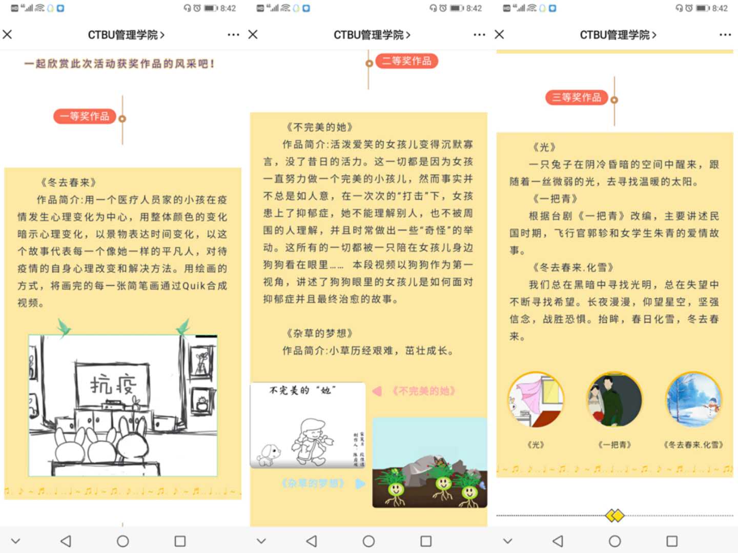 本次心理Flash视频制作活动以“心印暖阳 ‘帧’显阳光”为主题,面向全校学生广泛征集作品,受到了各学院学生的广泛关注,大家纷纷提交精心制作的作品,积极响应参与活动。经过激烈的角逐,《冬去春来》《光》《一把青》等十个稿件脱颖而出,赢得了难能可贵的决赛机会。在整合初赛得分、评委打分及线上投票多个指标过后,作品《冬去春来》最终以77.53的分数夺魁。该作品展示了疫情期间居家生活由冬天到春天的转变,表达了对宅家生活疫情阴霾之下冬日的展望与春天的绽放。作品《不完美的她》《杂草的梦想》分别以75.80、74.33的分数位列第二、第三。而《光》《一把青》《冬去春来·化雪》获得了三等奖。至此,经历了1个月的太阳集团2138第十六届“心印暖阳 “帧”显阳光”心理flash视频制作比赛活动圆满结束。