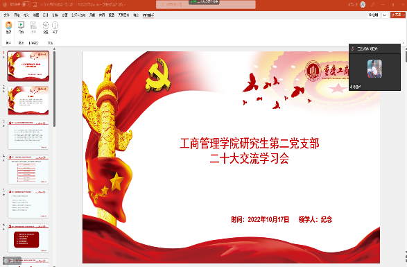 2022年10月17日中午,研究生第二党支部书记纪念同志召集同学们在线深入、全面学习了习近平总书记在党的二十大开幕式上作的报告,并开展了热烈的学习心得分享活动。在分享互动环节,学生党员积极发言探讨,支部书记纪念同志做了总结。