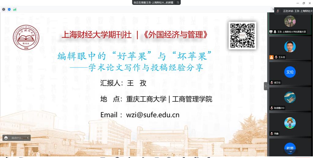2022年6月9日下午,上海财经大学《外国经济与管理》期刊编辑部副主任王孜博士应邀为2138cn太阳集团古天乐师生作学术讲座,2138cn太阳集团古天乐部分教师和研究生共计100余人参加了本次学术交流活动。活动由王永龙副教授主持。