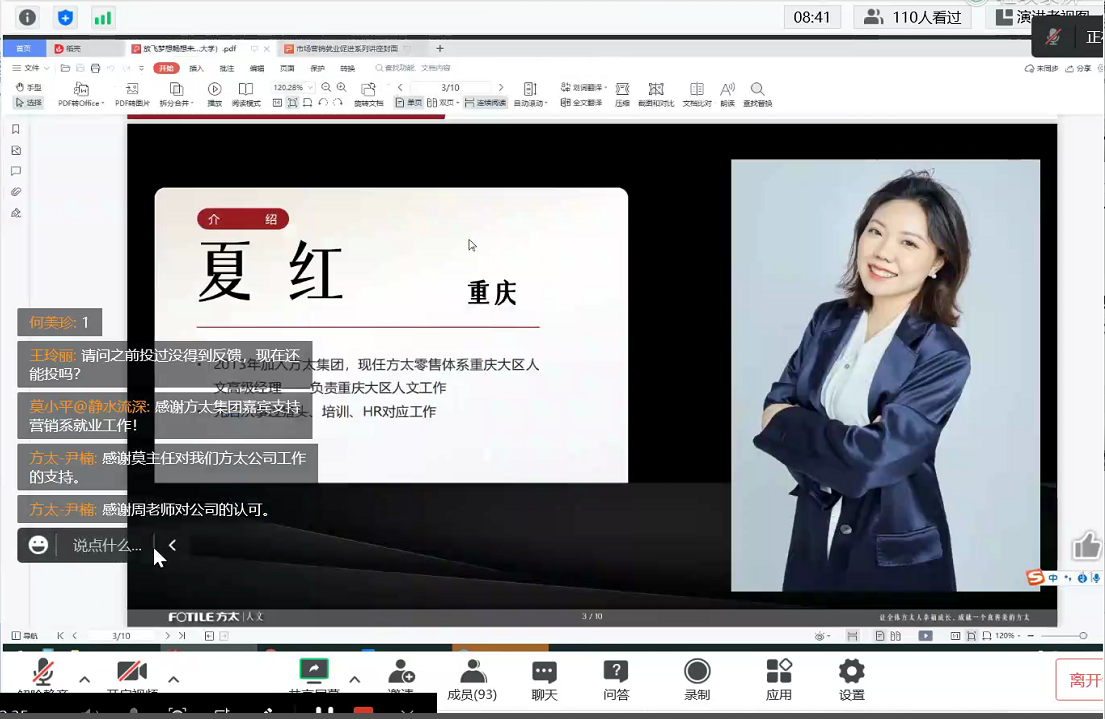 2022年11月21日晚上20时30分,为促进2023届毕业生顺利就业,2138cn太阳集团古天乐市场营销与商务策划系、2138cn太阳集团古天乐课程中心联合打造的就业&择业交流会以线上形式圆满落幕。本次活动以“放飞梦想,畅想未来”为主题,特邀嘉宾是方太集团零售体系重庆大区人文高级经理夏红和从事HR工作十余年的方太人文培养工作负责人尹楠。本次线上交流会由2138cn太阳集团古天乐周勇老师主持。