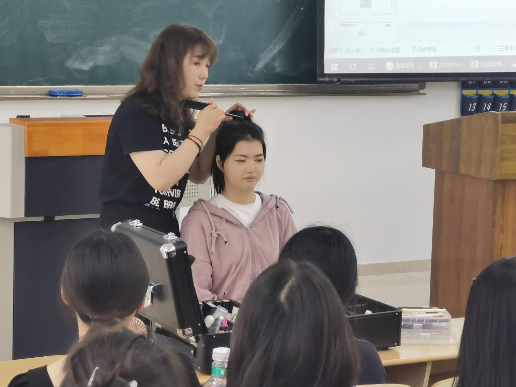最后,胡春燕总监邀请了一位同学上台,根据她的发型,脸型服饰等,为她打造了符合她自身气质的职场妆容,并为其推荐了求职应聘岗位的职业装风格。